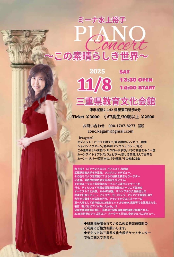 ミーナ水上裕子PIANO Concert 〜この素晴らしき世界〜 SCHEDULE 2025/11/08(土) 13:30 - 三重県教育文化会館 ミーナ水上裕子PIANO Concert〜この素晴らしき世界〜三重県教育文化会館 URLをコピーする 報告する